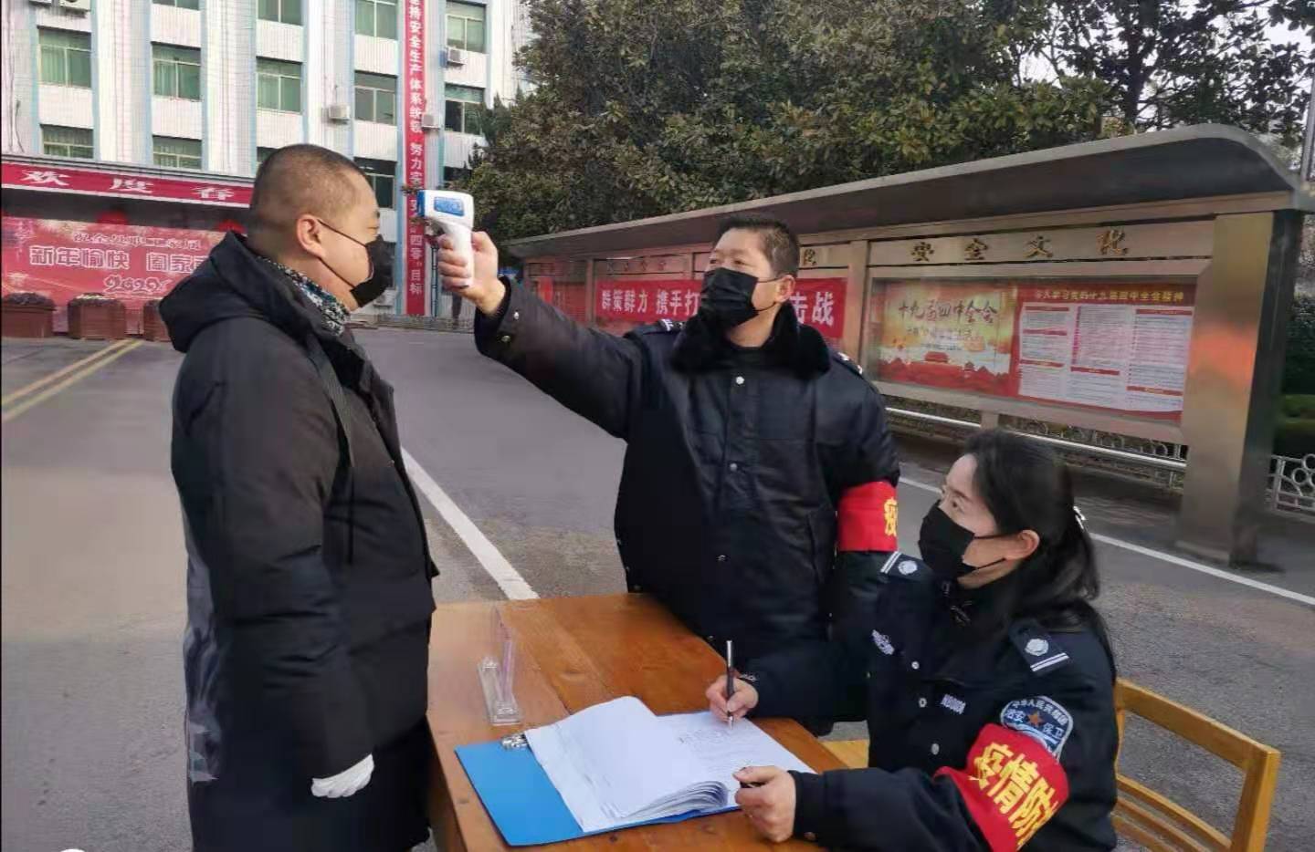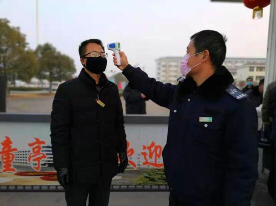 “董部长,请下车测体温。”物业分公司部长董昌军刚把车开到该处机关大门口,就被保卫人员杨瑞廷拦下了。“你们顶头上司你也敢拦?”旁边有人打趣道。“一车一检,一人一登记、测体温,我们是按门卫制度办事,坚决不能漏过一车一人,不是假期值班人员,其他人现在还不让进呢。”杨瑞廷解释说。