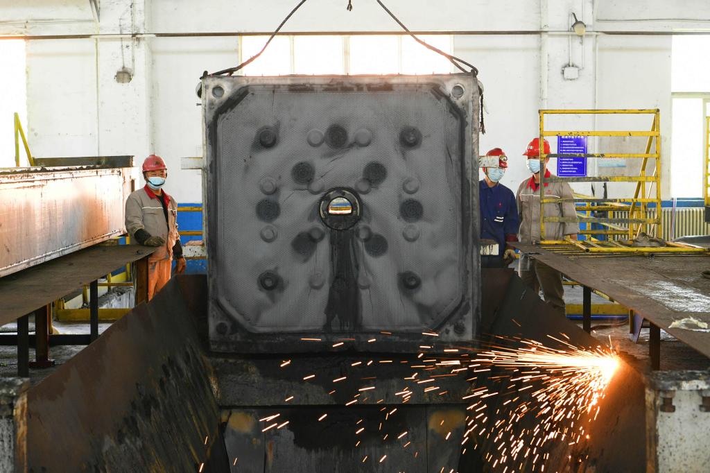 在该厂西区压滤一、二期17台压滤机更新改造施工现场,机电维修工正在紧张地安装新型压滤机、拆除旧设备,认真对各台压滤机设备进行检查……2022年集团公司“两会”提出,要大力推进煤泥无量化项目改造。按照集团公司工作部署,完成后续煤泥减量化改造也是临选厂2022年要完成的“六件大事”之一。目前,该厂正对西区压滤一、二期17台压滤机进行更新改造,改造工作时间紧、任务重,近期又因封厂管控,施工人员紧张,他们极力克服疫情影响,力争在工期内完成压滤机的更换改造任务。