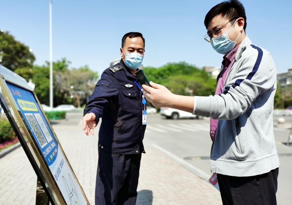 5月2日上午10:10,办公中心西门岗值班职工孙正国(左一)在对访客做疫情防控“双码”检查。他表示,“五一”期间也要严格把好“入口关”,坚决保证疫情防控安全。