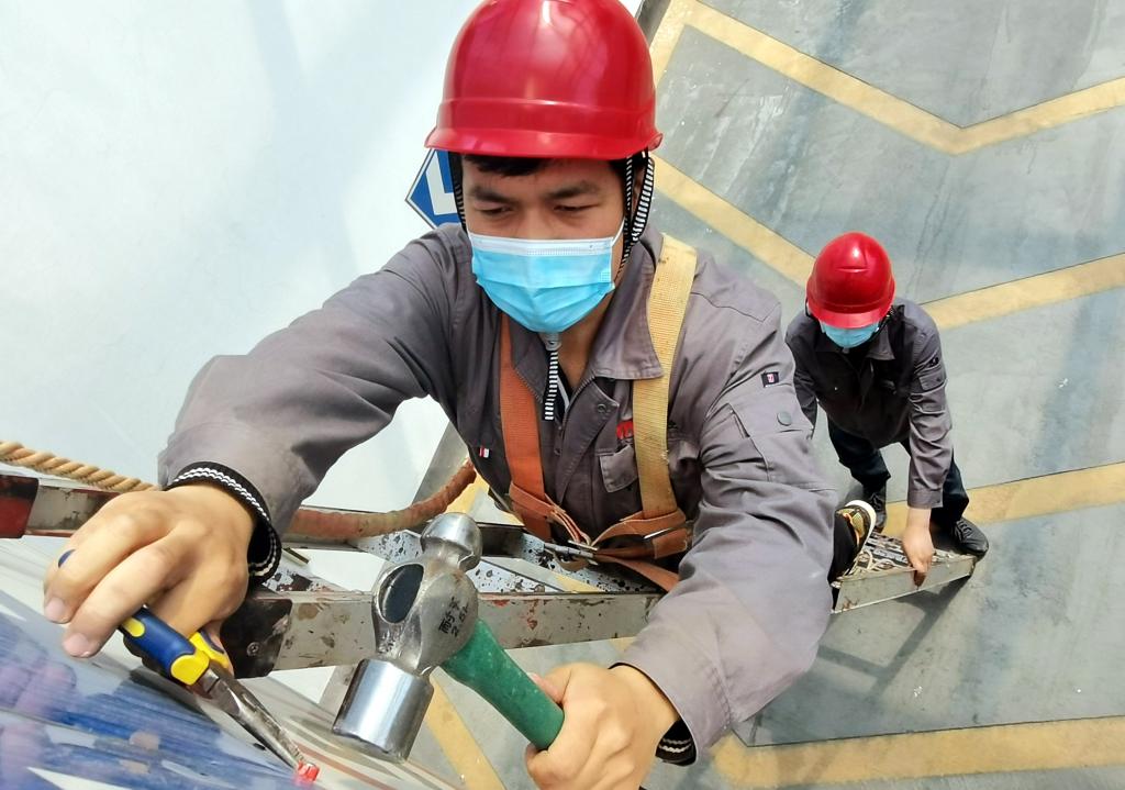 10:50,william英国中文官网集团“首席高徒”、物业分公司机电运营公司职工李冠磊在和工友高少浩处理办公中心东侧地下车库损坏的限高牌。作为机电维修值班,他们要确保“五一”期间大楼各项机电设施运行完好。