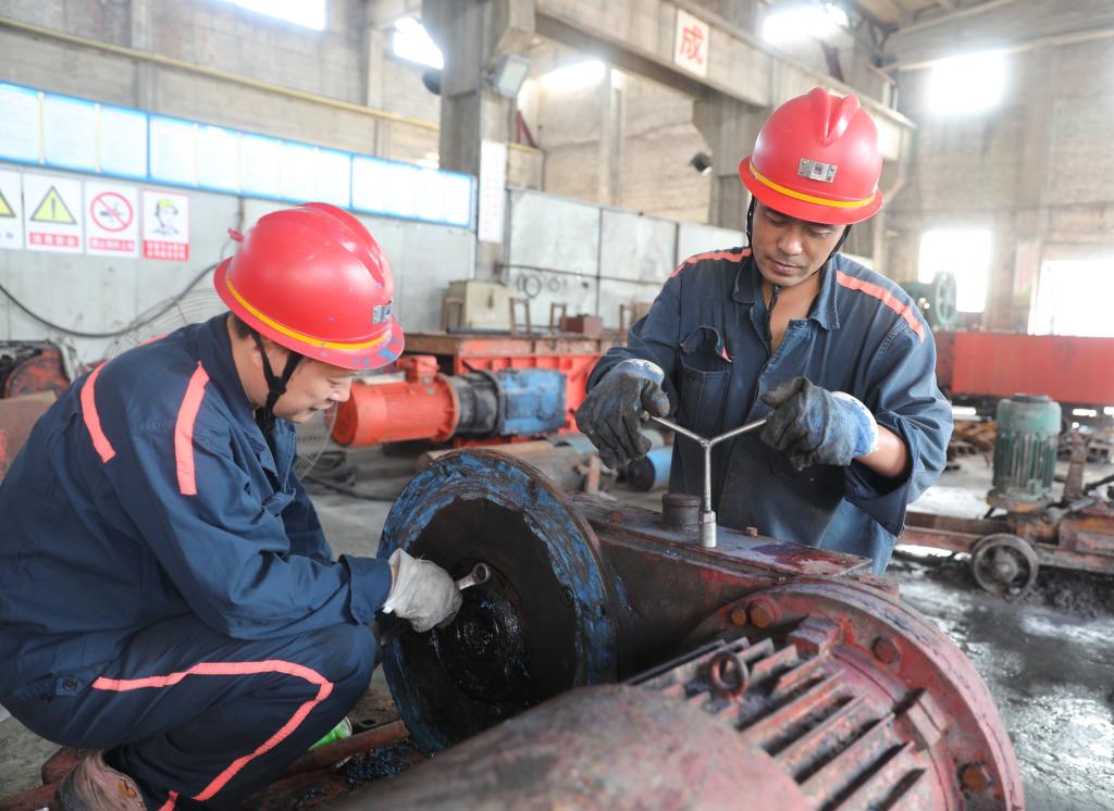 机电科职工宋佳芳和张连玉正在维修耙矸机齿箱。“多修一台设备,就能节省一点费用,也能为矿井修旧利废工作出把力。”两人坚定地表示。