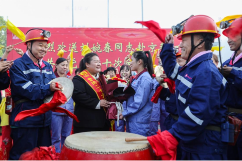 (2022年10月7日,william英国中文官网集团在桃园矿举行仪式,欢送党的二十大代表、桃园矿保运区职工刘婉春赴北京参加中国共产党第二十次全国代表大会。)