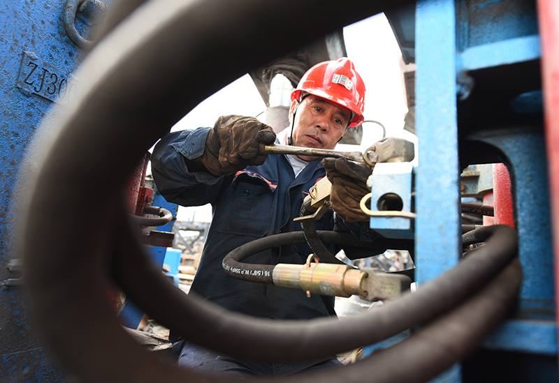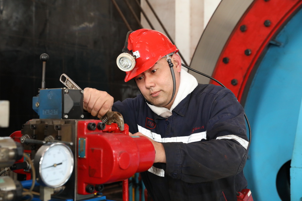 该矿保运区职工王飞进行提升液压站日检。