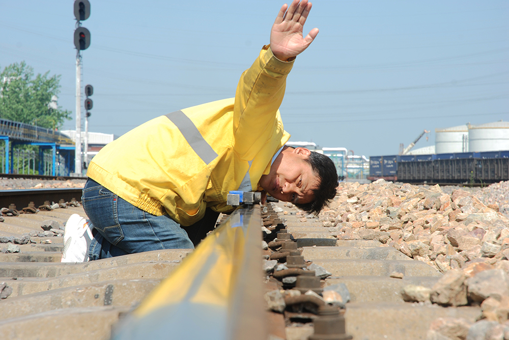 图为线路工代福常进行线路高低水平整治作业