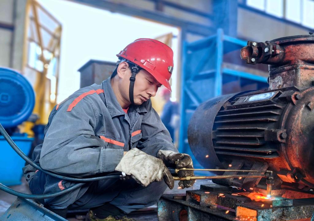 图为机电科机修工王雷正在焊接电机