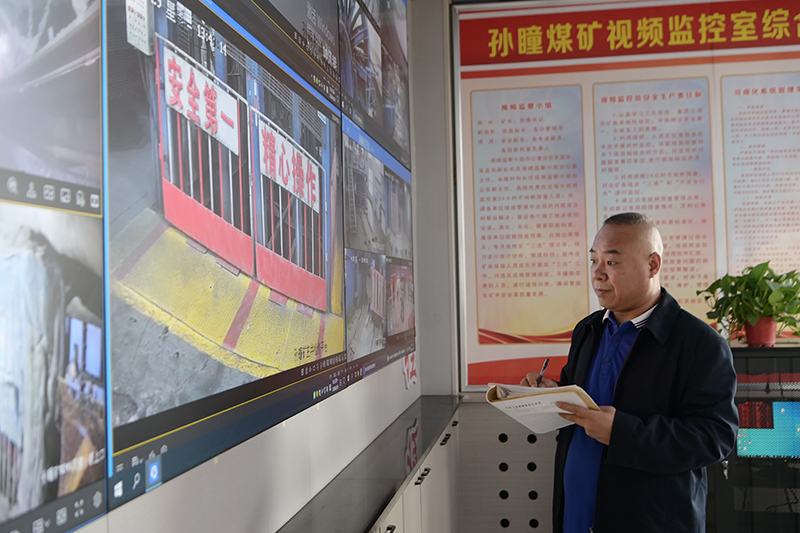 在该矿视频监控室,面对6块监视大屏的24个作业点,安监员王建两眼来回逡巡,紧盯屏幕,认真观察每一个作业场所的规范作业情况,时而在隐患登记簿上记录,时而拿起电话联系,为矿井守好安全生产的第一道关口忙得不亦乐乎。