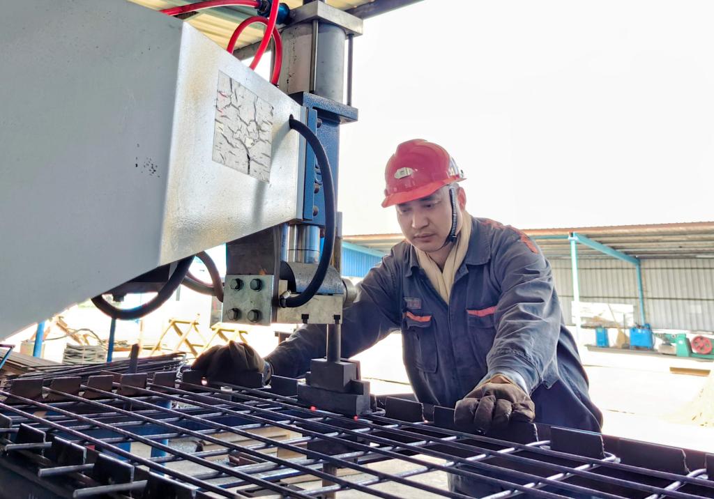 图为机电科支护工赵永罗正在焊制钢筋网