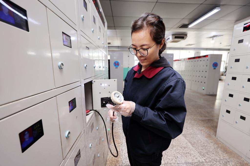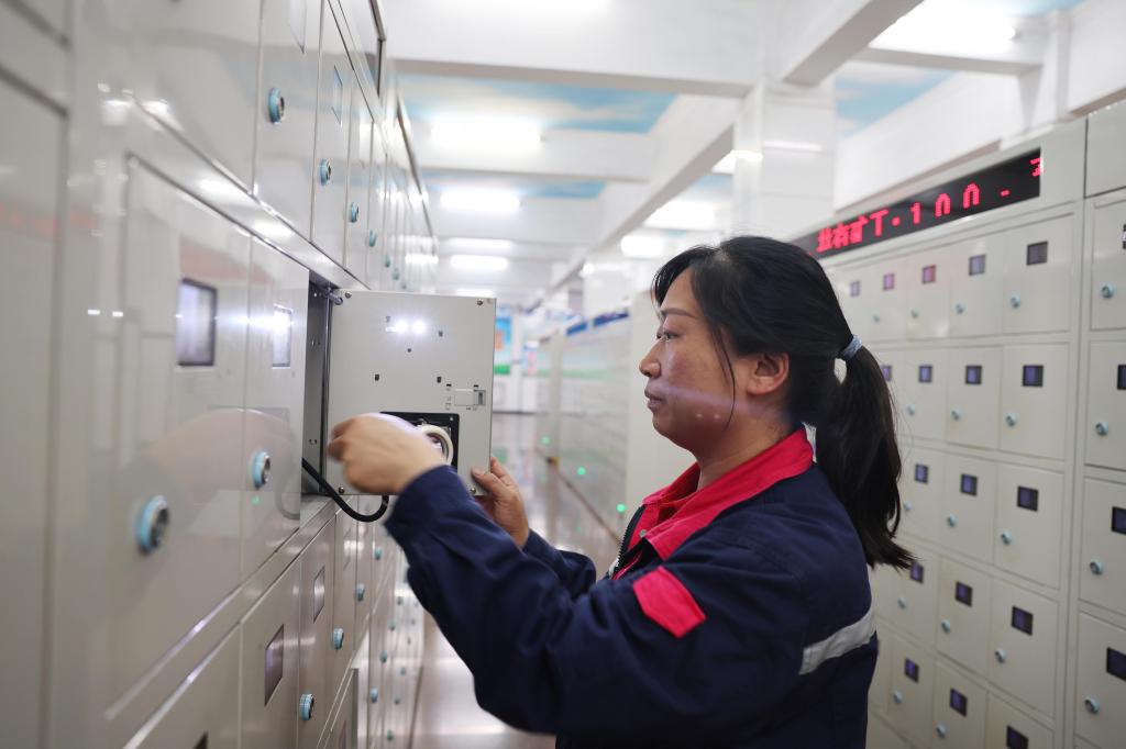 图为该矿保运区灯房女工王方正在检查矿灯充电情况。