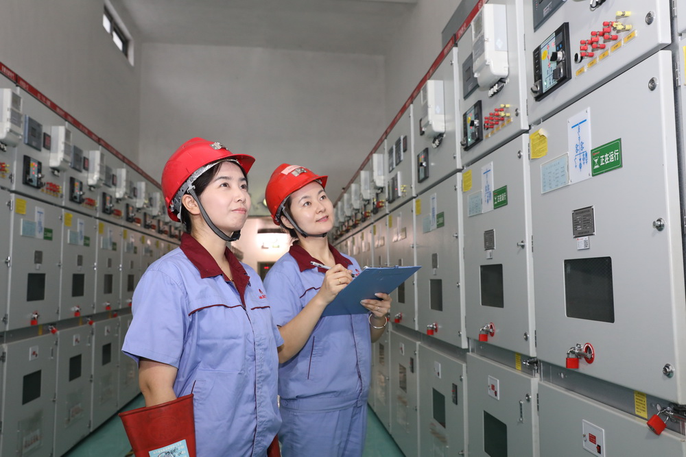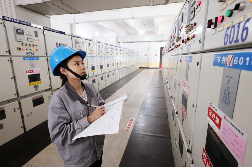该矿保运区35KV变电女工谢妍妍、张海玲进行岗位操作。