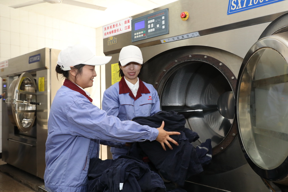 该矿物业管理科洗衣房女工赵文芳、李程程清洗工作服。