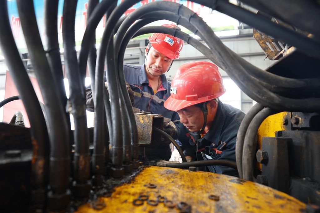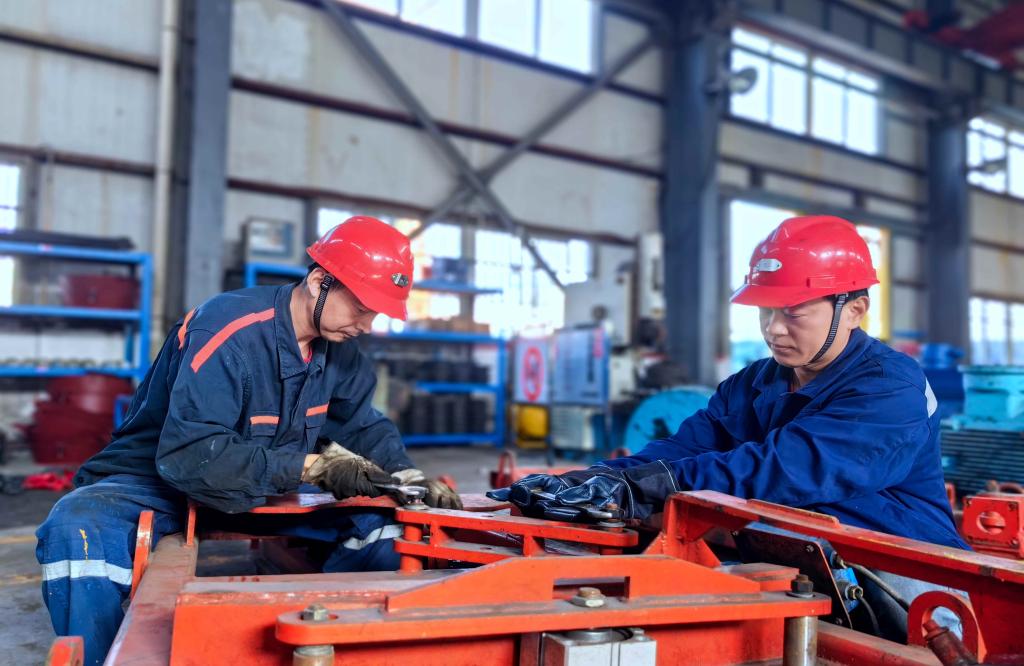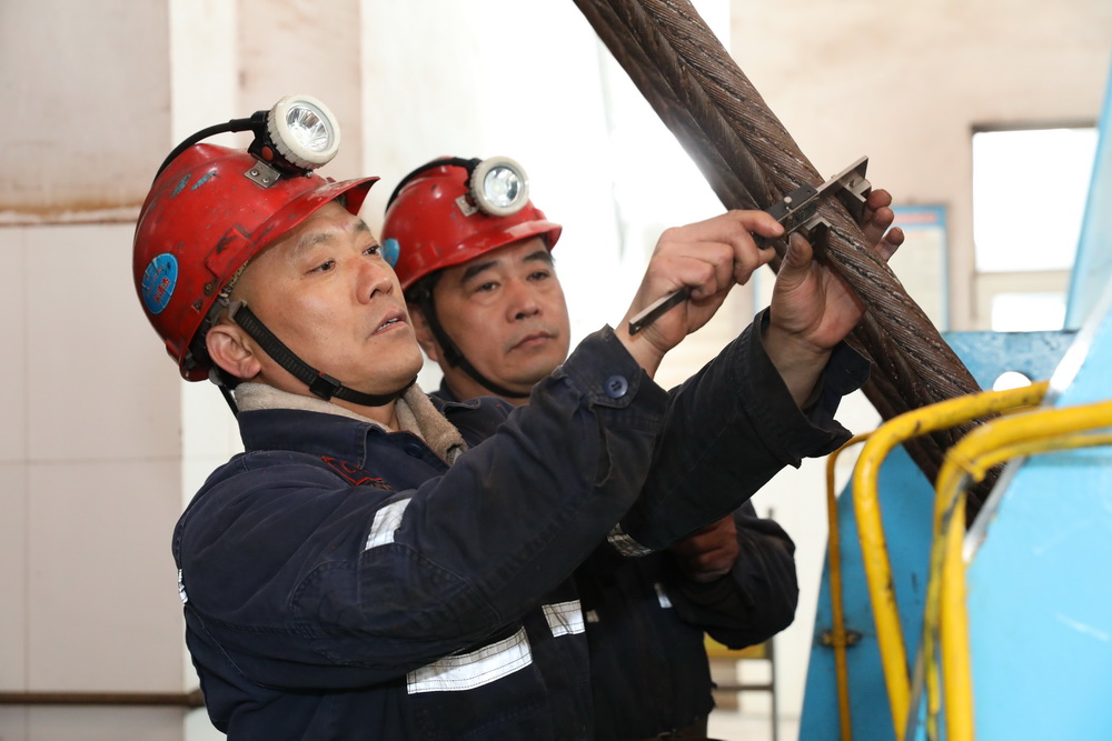 该矿保运区职工宋清杰(左)与工友查验主提升钢丝绳。