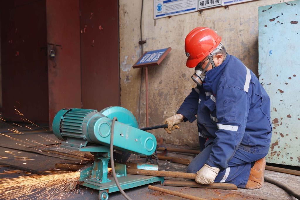 图为该矿机电科(机厂)职工曹辉正在切割加工材料。