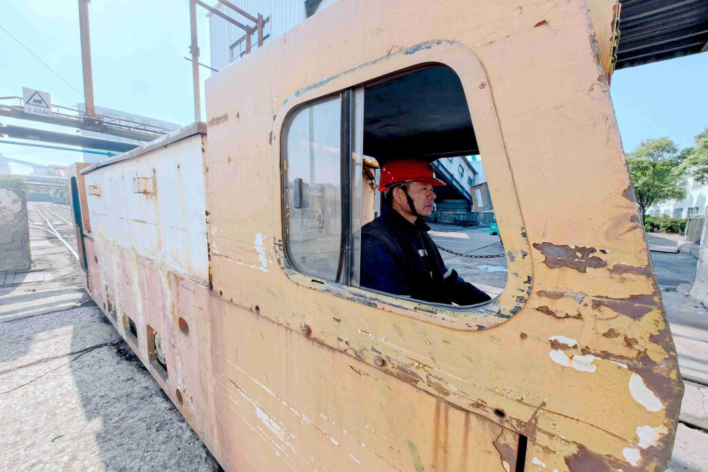 图为运输区电机车司机刘召正在拉运即将入井的物料