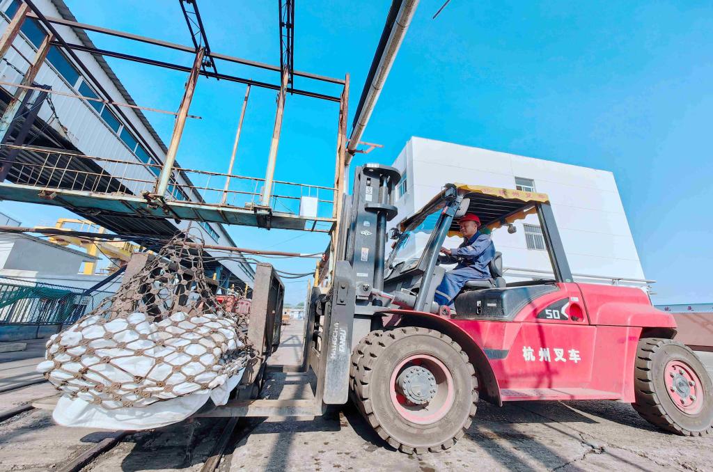 图为运输区叉车司机张振正在叉运物料
