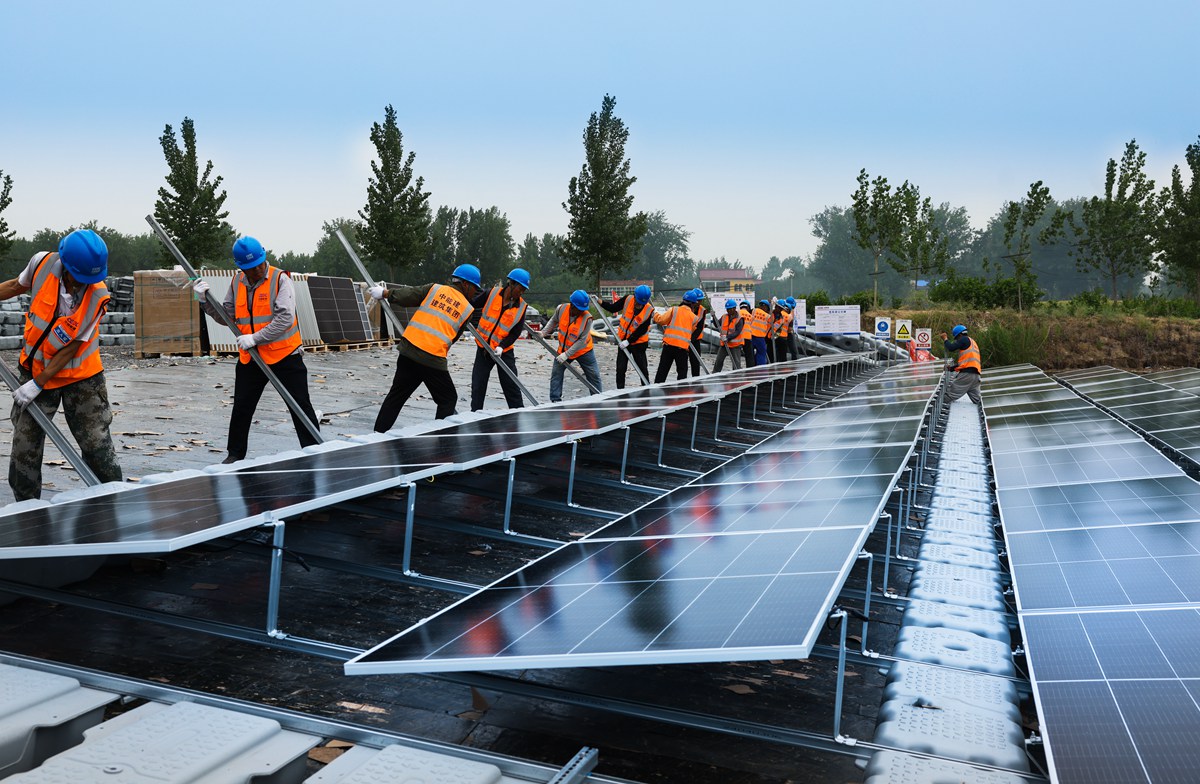 5月11日,电力分公司青东塌陷区水面光伏板正在组装下水