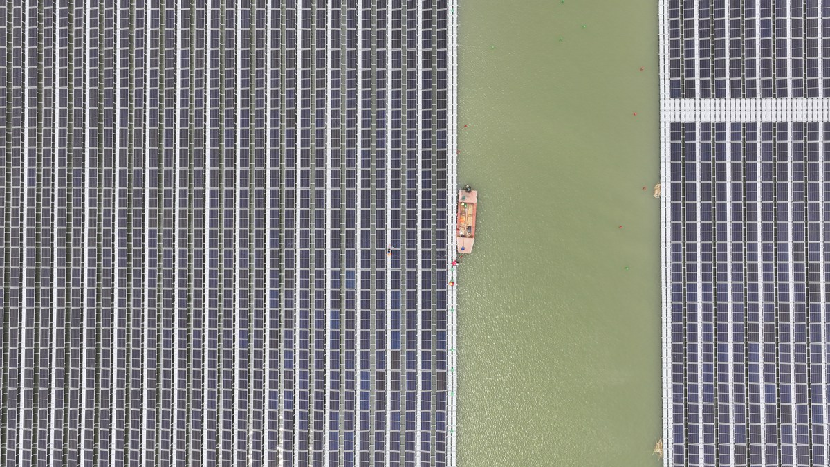 5月11日,航拍电力分公司青东塌陷区28MW水面光伏发电项目建设现场