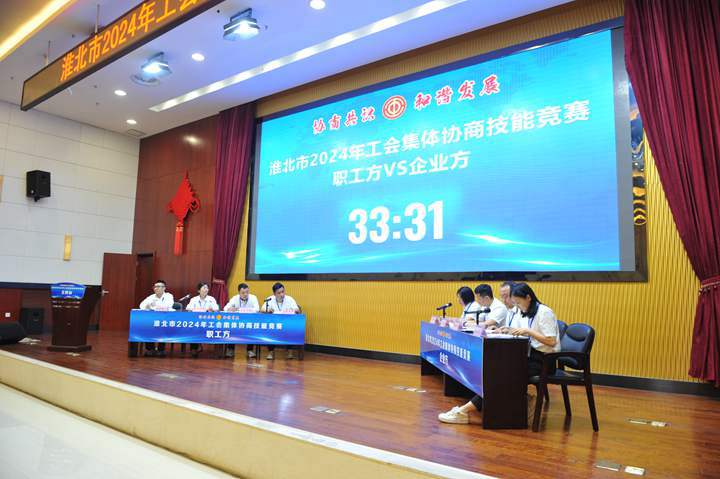 竞赛以“协商共识、和谐发展”为竞赛主题,旨在充分发挥集体协商制度在协调劳动关系中的重要作用,锤炼一支高素质、善沟通、会协商、有担当的集体协商人才队伍,切实提升淮北市集体协商质量,促进劳动关系和谐稳定。此次竞赛汇集了全市各县区、行业工会及william英国中文官网集团、皖北煤电集团、中煤矿建集团、淮海实业集团10支代表队伍,他们围绕职工权益维护、福利待遇等问题,在模拟场景中进行集体协商,由评委组对协商呈现效果进行专业点评。各支参赛队伍围绕“协商共识、和谐发展”活动主题,依据理、法、情,透彻分析案例、准确运用政策、缜密逻辑推理、合理设置身份、流畅配合协作,各抒己见,据理力争,较好展示了参赛队伍的风采,比赛现场气氛热烈,紧张有序。竞赛评定团体一等奖、二等奖、三等奖和个人奖项“最佳协商员”“优秀协商员”“协商能手”,同时设置优秀组织奖。