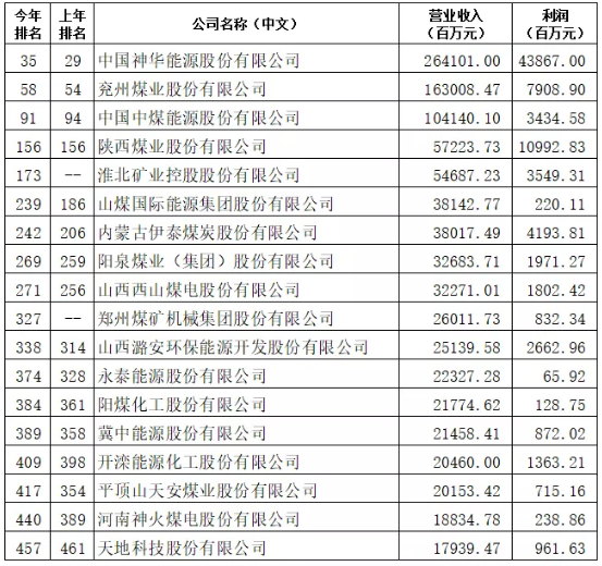 2019中国500强排行榜发布!煤炭行业18家公司上榜!