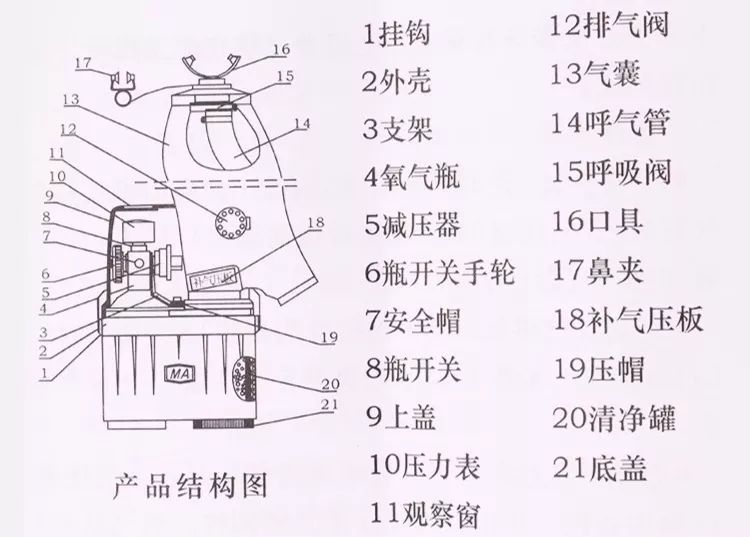 3、清净罐内装入定量的符合标准的CO2吸收剂形成CO2过滤系统。平时所有系统装置都装在壳体之中,使用者能通过上盖上的观察窗清楚地看到压力表的压力指示。在下壳上设有皮带孔和背带,使用者可固定在矿工皮带上或挎在肩上。4、供氧方式有以下三种: